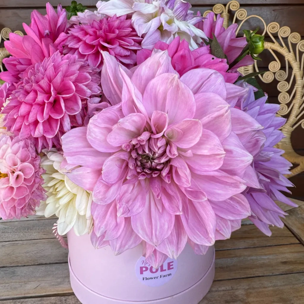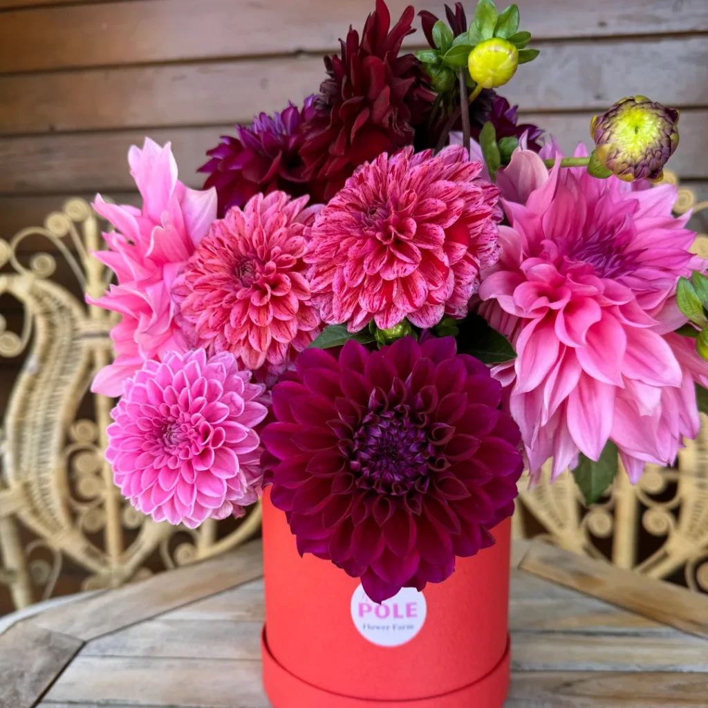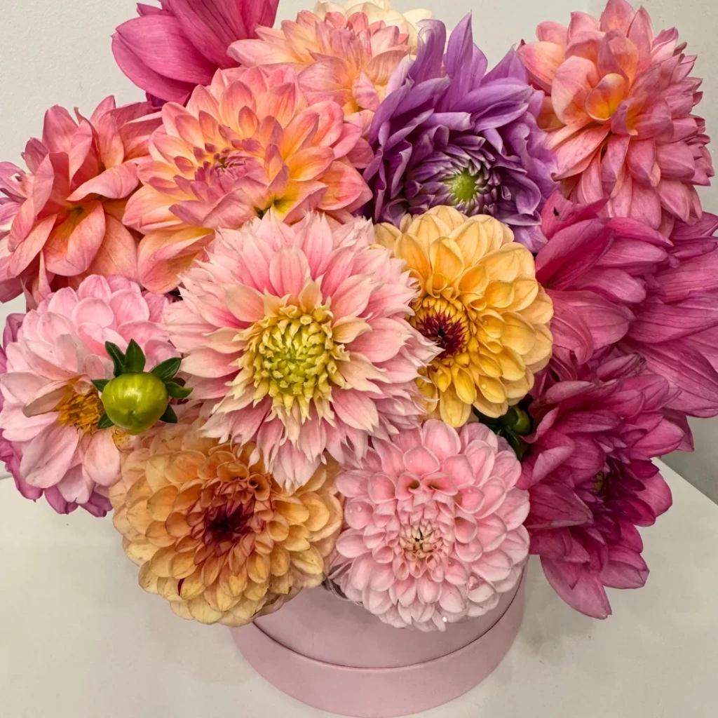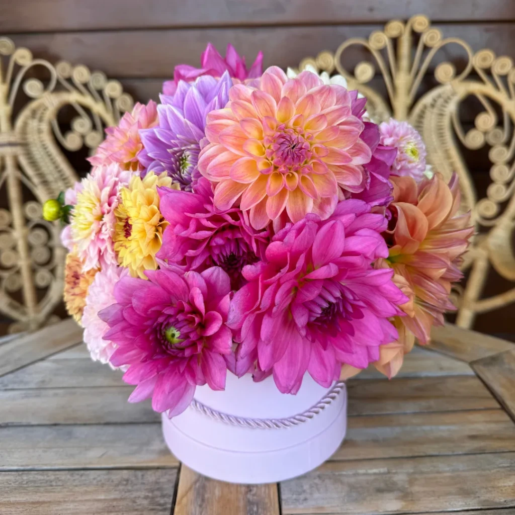 (bardzo duży, efektowny bukiet z dalii talerzowych i dekoracyjnych) - Flower Box (15 cm) – 150 zł